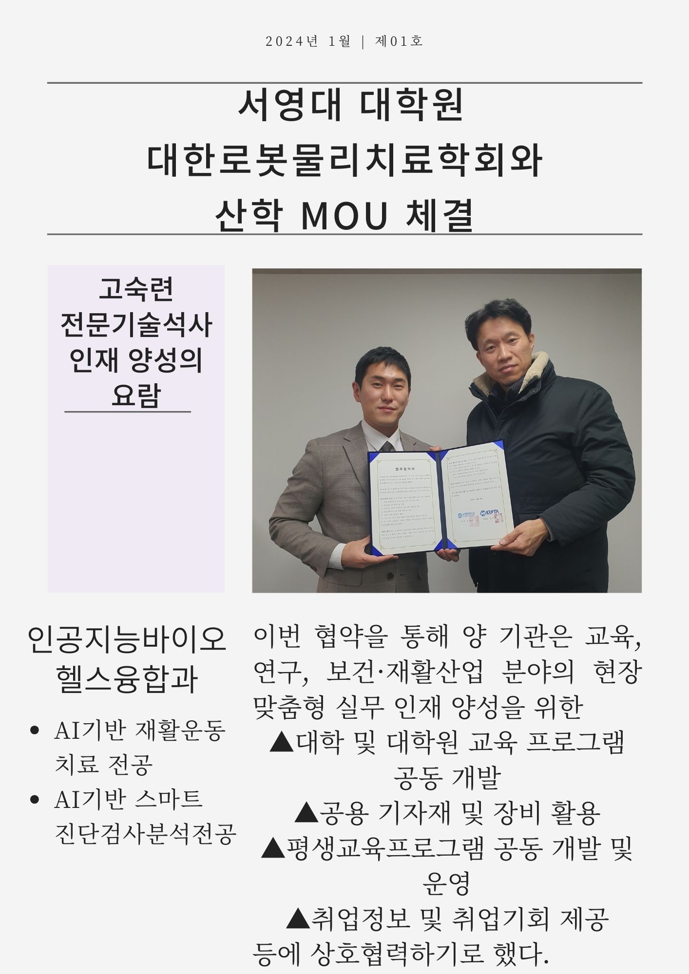 ○ 우리대학 대학원은 최근‘대한로봇물리치료학회’와 산학협력 업무협약을 체결했다.