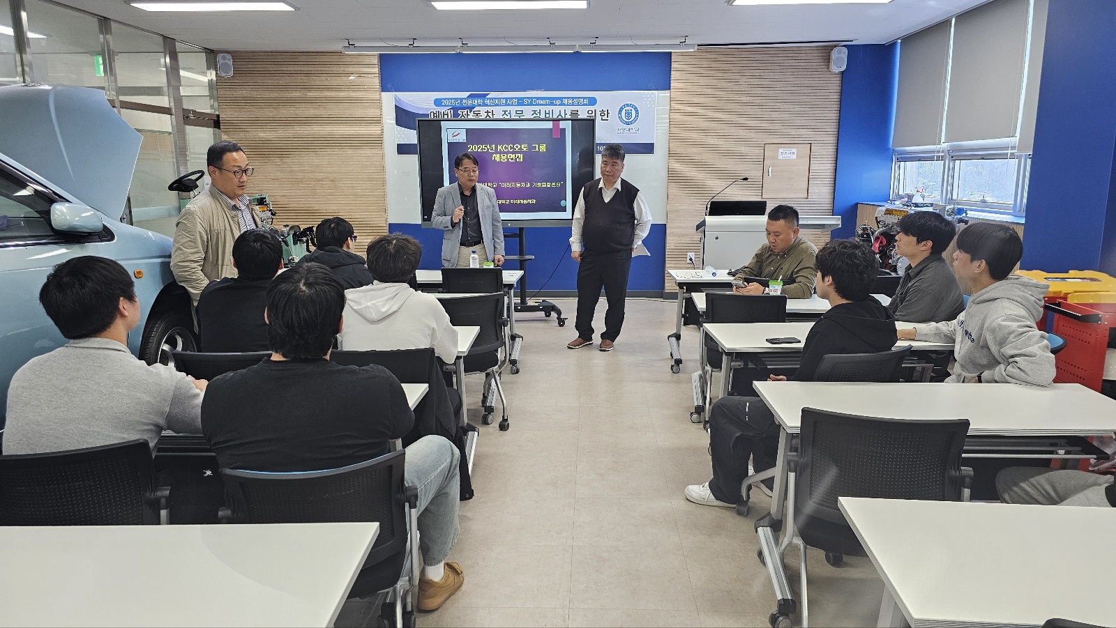 KCC오토그룹 서비스 총괄 김 * 식 전무 이사님과 각 브랜드 본부장 및 이사님 께서 본교 미래자동차과 2학년 재학생들을 위한 특강을 하셨습니다. KCC오토그룹은 벤츠, 포르쉐, 혼다, 닛산/인피니티, 재규어/랜드로버, 지프, 푸조 등 7개 브랜드의 서비스센터와 전시장을 운영하고 있으며