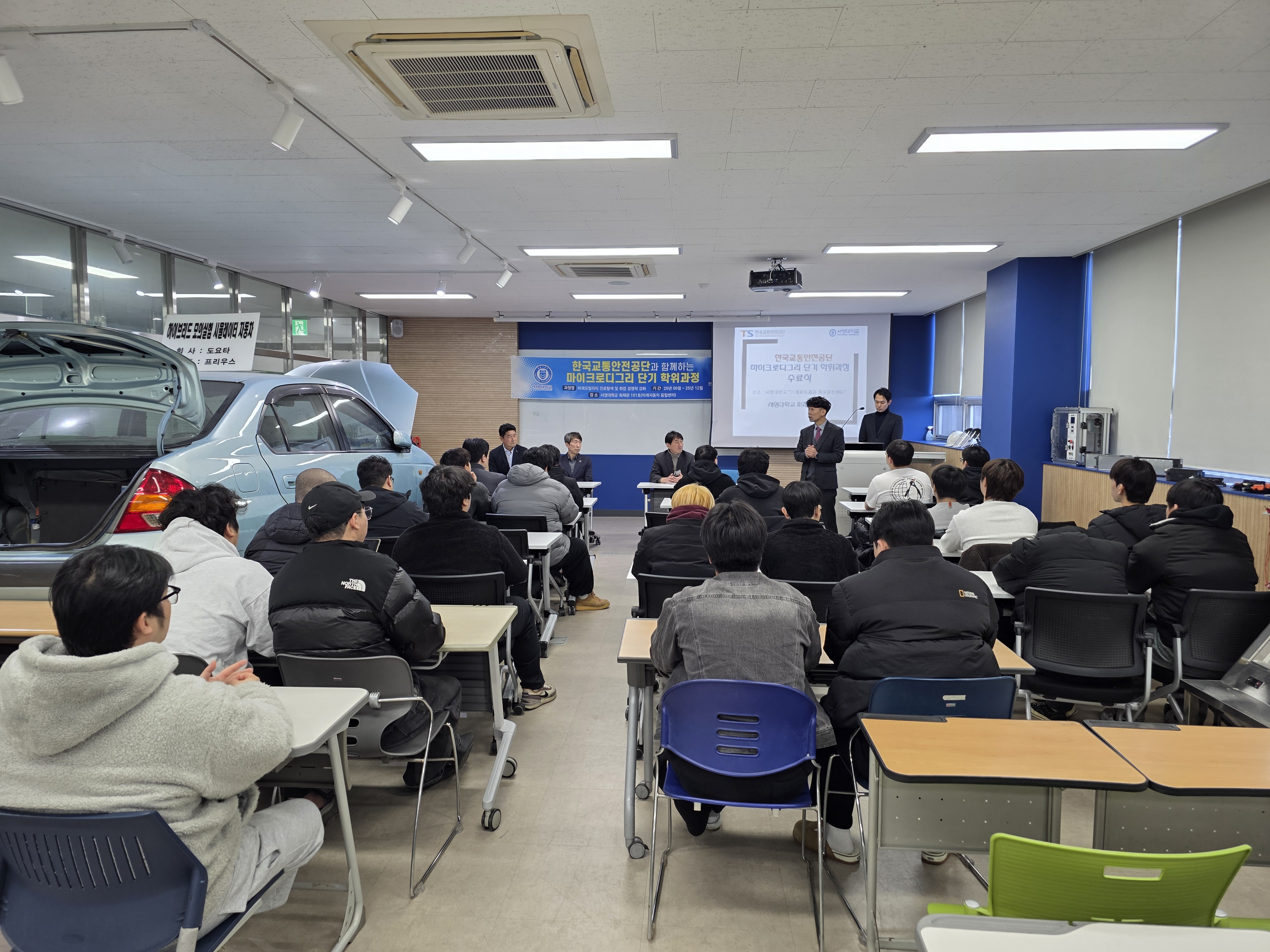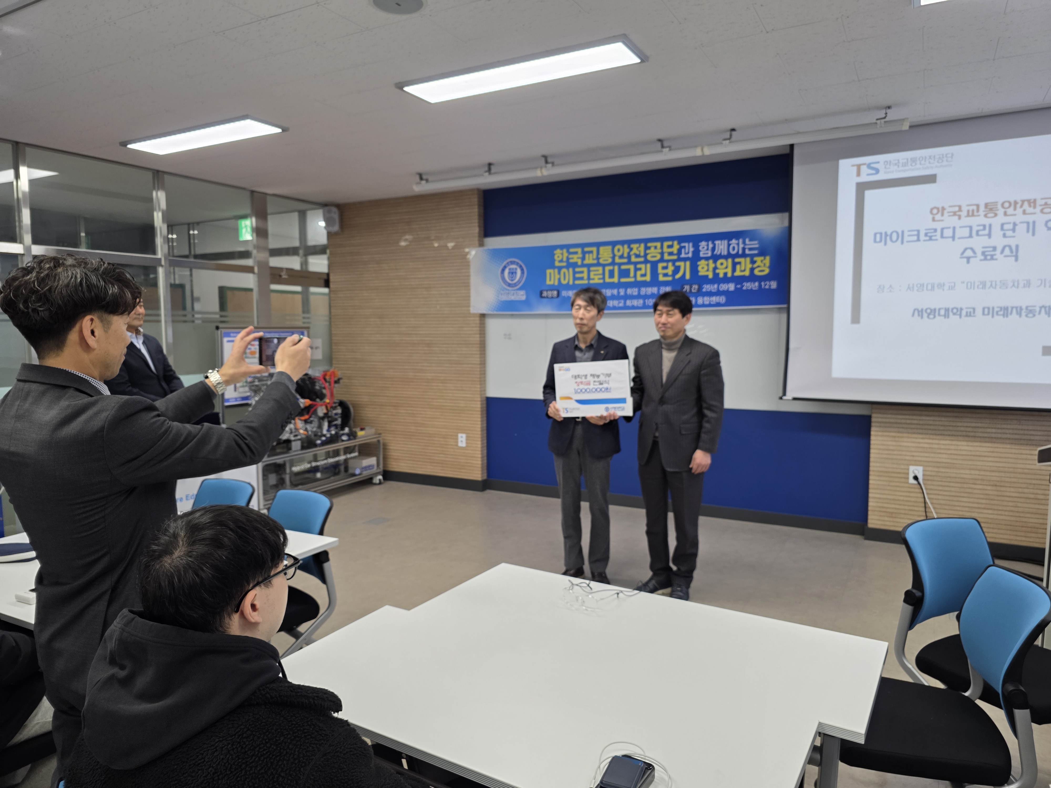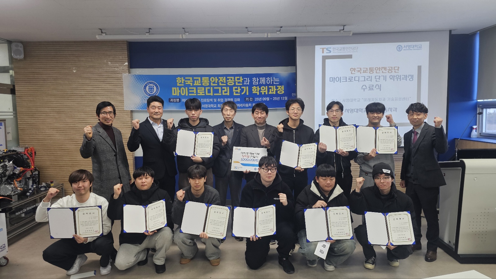 서영대학교 미래자동차과는 한국교통안전공단 서울본부와 공동으로 운영한 마이크로디그리 단기 학위과정의 성공적인 운영을 기념하여, 수료학생을 대상으로 수료식 및 장학금 수여식을 진행하였습니다.