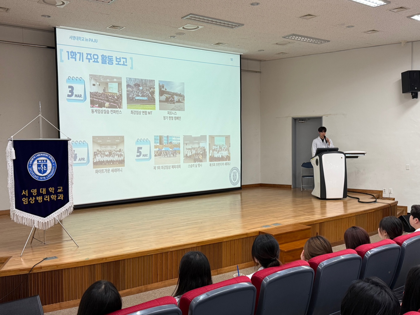 최강임상 5대 학생회 부학회장인 24학번 하현민 학생의 사회로 진행된 종강 총회를 통해 1학기 주요 일정을 돌아보았다. 1학기 신입생 WELCOME CEREMONY를 시작으로, 3학년 동계임상실습 컨퍼런스, 1학기 최강임상 개강총회, 2025 최강임상 연합MT, 상반기 피트니스 정기헌혈캠페인, 제 6회 White Gown Ceremony, 제 1회 최강임상 체육대회, 2학년 제 5회 프런티어진단의과학세미나, 3학년 AHA BLS-Provider 교육까지, 바쁘지만 알찼던 한 학기 일정을 돌아보는 시간을 가졌다.